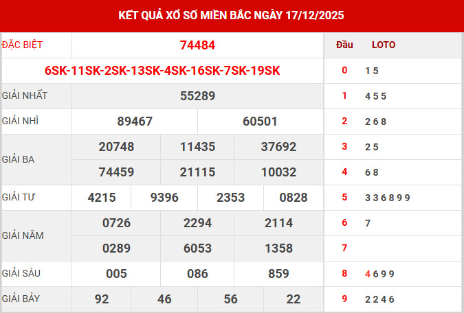 Ngày 17/12/2025, giải đặc biệt của Xổ số Miền Bắc thuộc về dãy số 74484, trong đó cặp 84 là tâm điểm dành cho những ai quan tâm tới các dấu hiệu lặp lại.