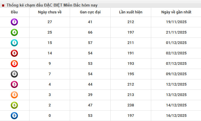 Thống kê cho thấy chạm đề lâu chưa xuất hiện nhất là chạm 7 (bao gồm 19 cặp số có chứa số 7), đã 20 ngày chưa ra.