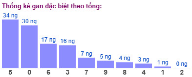 Thống kê cho thấy tổng đề lâu chưa xuất hiện nhất là tổng 5 (bao gồm 10 cặp số: 05, 14, 23, 32, 41, 50, 69, 78, 87, 96) đã 34 ngày chưa ra.