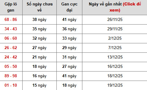 Nổi bật nhất là cặp 68 – 86, hiện đã 38 ngày chưa xuất hiện, trong khi mốc gan cực đại là 41 ngày, lần về gần nhất ghi nhận 26/11/2025. Trạng thái gan sâu kéo dài, áp sát vùng cực đại cho thấy áp lực giải tỏa đang tích tụ mạnh, khiến cặp số này trở thành tâm điểm cần cân nhắc trong các phương án dự đoán xổ số miền bắc chuẩn xác.