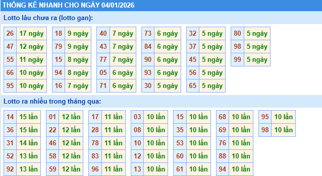 Thống kê – dự đoán XSMB mùng 4/1/2026 Thần Tài hôm nay mang đến cái nhìn tổng quan về XSMB chiều nay, tập trung vào các con số giải đặc biệt, lô có tần suất xuất hiện cao và lâu chưa về sau nhiều kỳ quay. Đây là cơ sở quan trọng để bạn đọc tham khảo khi theo dõi dự đoán XSMB 4/1 và lựa chọn bộ số phù hợp.
