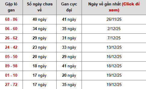 Nổi bật nhất là cặp 68 – 86, hiện đã 39 ngày chưa xuất hiện, chỉ còn cách mốc gan cực đại 41 ngày đúng 2 ngày, lần về gần nhất ghi nhận 26/11/2025. Trạng thái gan sâu kéo dài và tiệm cận vùng cực đại cho thấy áp lực giải tỏa đang tích tụ rất lớn, khiến cặp số này trở thành tâm điểm cần đặc biệt lưu ý trong các phương án dự đoán xổ số miền bắc chuẩn xác.