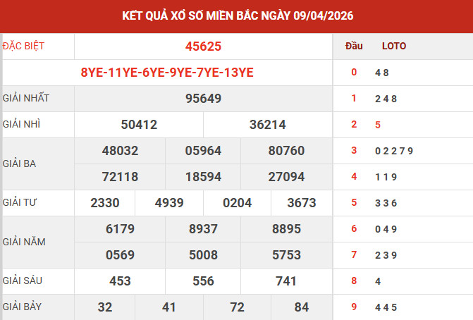 Căn cứ vào bảng kết quả xổ số miền Bắc ngày 9/4/2026 vừa được công bố, các chuyên gia tiến hành tổng hợp và phân tích các số liệu trọng tâm, qua đó mang đến những nhận định chi tiết nhằm hỗ trợ bạn đọc tham khảo và dự đoán XSMB 10/4/2026 một cách hiệu quả.