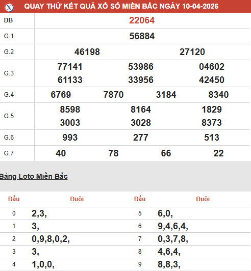 Tham khảo dự đoán xổ số miền bắc mùng 10/4/2026 chuẩn xác, bạn sẽ nhận được các thông tin chi tiết về giải đặc biệt, giải tám, đầu đuôi, bao lô 2 số cũng như các thống kê khác đáng chú ý.