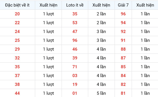 Các số 91, 93, 94, 95, 00, 04, 06, 20 (1 lượt) → phân bố rải rác, chưa hình thành xu hướng chính.