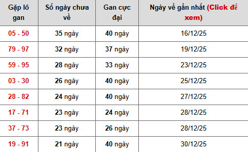 Nổi bật nhất là cặp 05 – 50, hiện đã 35 ngày chưa xuất hiện, chỉ còn cách mốc gan cực đại 40 ngày đúng 5 ngày, lần về gần nhất ghi nhận 16/12/2025. Trạng thái gan cao kéo dài cho thấy áp lực giải tỏa đang tích tụ mạnh, khiến cặp số này trở thành điểm nhấn đáng cân nhắc trong các phương án dự đoán xổ số miền bắc ngày 21/1/2026 chuẩn xác.