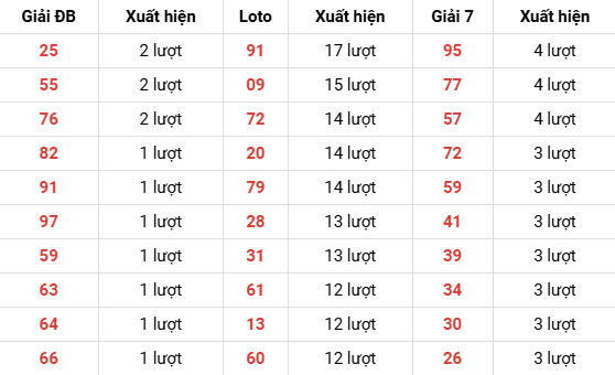 • Các số xuất hiện nhiều nhất: 25, 55, 76 (đều 2 lượt) → đây là nhóm số có dấu hiệu lặp lại đáng chú ý.