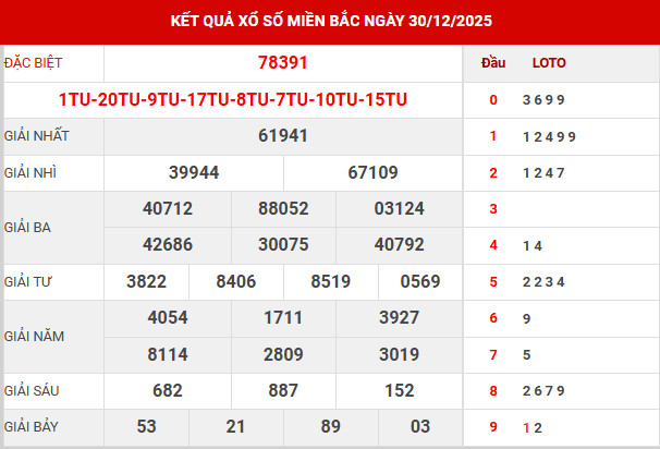 Căn cứ vào bảng kết quả xổ số miền Bắc ngày 30/12/2025 vừa được công bố, các chuyên gia tiến hành tổng hợp và phân tích các số liệu trọng tâm, qua đó mang đến những nhận định chi tiết nhằm hỗ trợ bạn đọc tham khảo và dự đoán XSMB 31/12/2025 một cách hiệu quả.