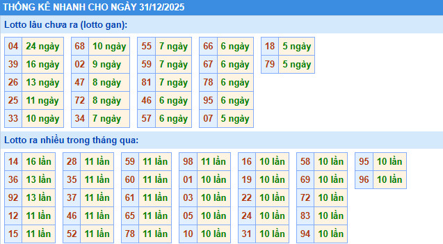 Thống kê – dự đoán XSMB ngày 31/12/2025 Thần Tài hôm nay mang đến cái nhìn tổng quan về XSMB chiều nay, tập trung vào các con số giải đặc biệt, lô có tần suất xuất hiện cao và lâu chưa về sau nhiều kỳ quay. Đây là cơ sở quan trọng để bạn đọc tham khảo khi theo dõi dự đoán XSMB 31/12 và lựa chọn bộ số phù hợp.