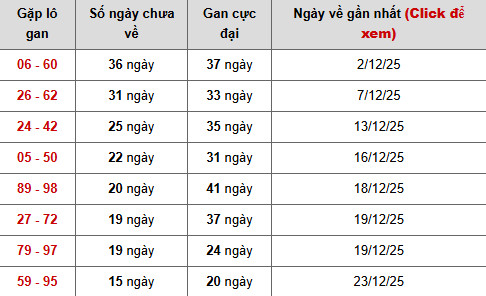Nổi bật nhất là cặp 06 – 60, hiện đã 36 ngày chưa xuất hiện, chỉ còn cách mốc gan cực đại 37 ngày đúng 1 ngày, lần về gần nhất ghi nhận 02/12/2025. Trạng thái gan cận đỉnh kéo dài cho thấy áp lực giải tỏa đang ở mức rất cao, khiến cặp số này trở thành tâm điểm cần đặc biệt cân nhắc trong các phương án dự đoán xổ số miền bắc chuẩn xác.