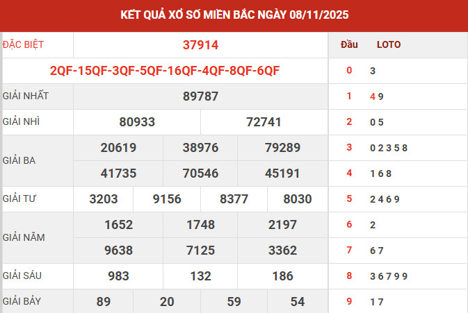 Ngày 8/11/2025, giải đặc biệt của Xổ số Miền Bắc thuộc về dãy số 37914, trong đó cặp 14 là tâm điểm dành cho những ai quan tâm tới các dấu hiệu lặp lại.