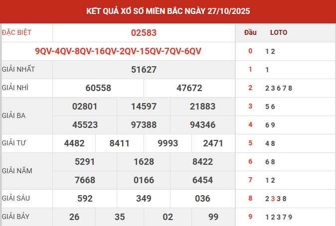 Ngày 27/10/2025, giải đặc biệt của Xổ số Miền Bắc thuộc về dãy số 02583, trong đó cặp 83 là tâm điểm dành cho những ai quan tâm tới các dấu hiệu lặp lại.