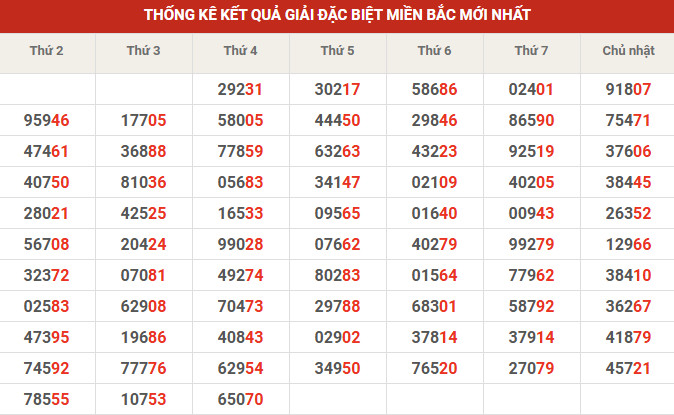 Thống kê giải đặc biệt 10' tuần gần đây