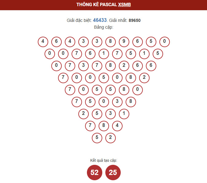 - Dựa vào thống kê Pascal, tham khảo cặp số đặc biệt dễ ra : 52 - 25